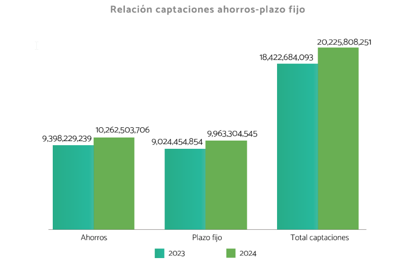 Al cierre del año 2023, la tasa de préstamos se situó en el 12.36 % y al cierre del año 2024 esta fue del 12.84 %, apenas con 0.48, además de que se reconocieron intereses por certificados financieros y ahorros a los socios por más de RD$787 millones y se liquidaron 53 préstamos de socios fallecidos por un monto de RD$36,118,456.91.